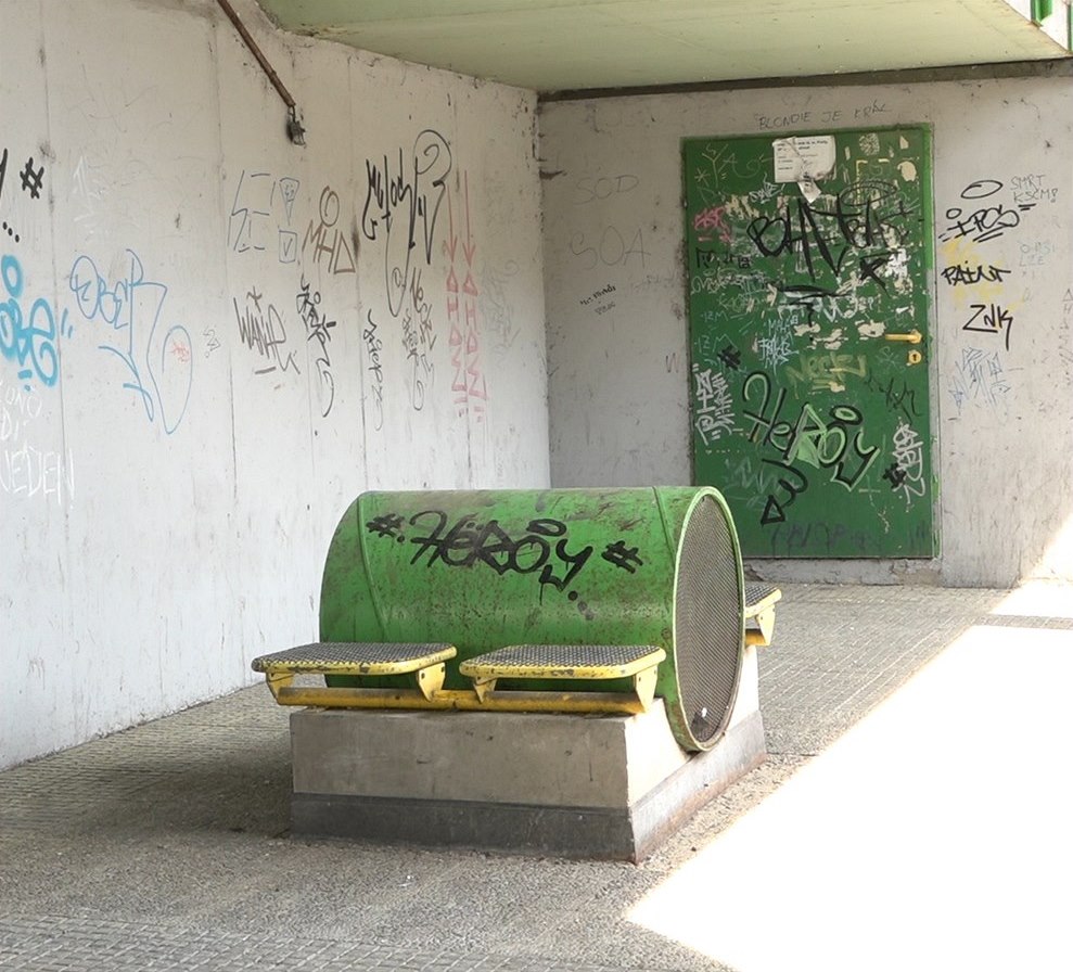 Železné zábradlí a sloupy jsou na většině místech zkorodované, rez stekla na fasádu a voda prosakující betonovými lávkami tvoří na chodníku boule, které vypadají jako stalagmity v jeskyních. Celkový vzhled nevylepšují ani lavičky na zastávkách z drátěných mříží a s “okrasným“ válcem. V několika případech je ve válcích díra a jsou plné odpadků.