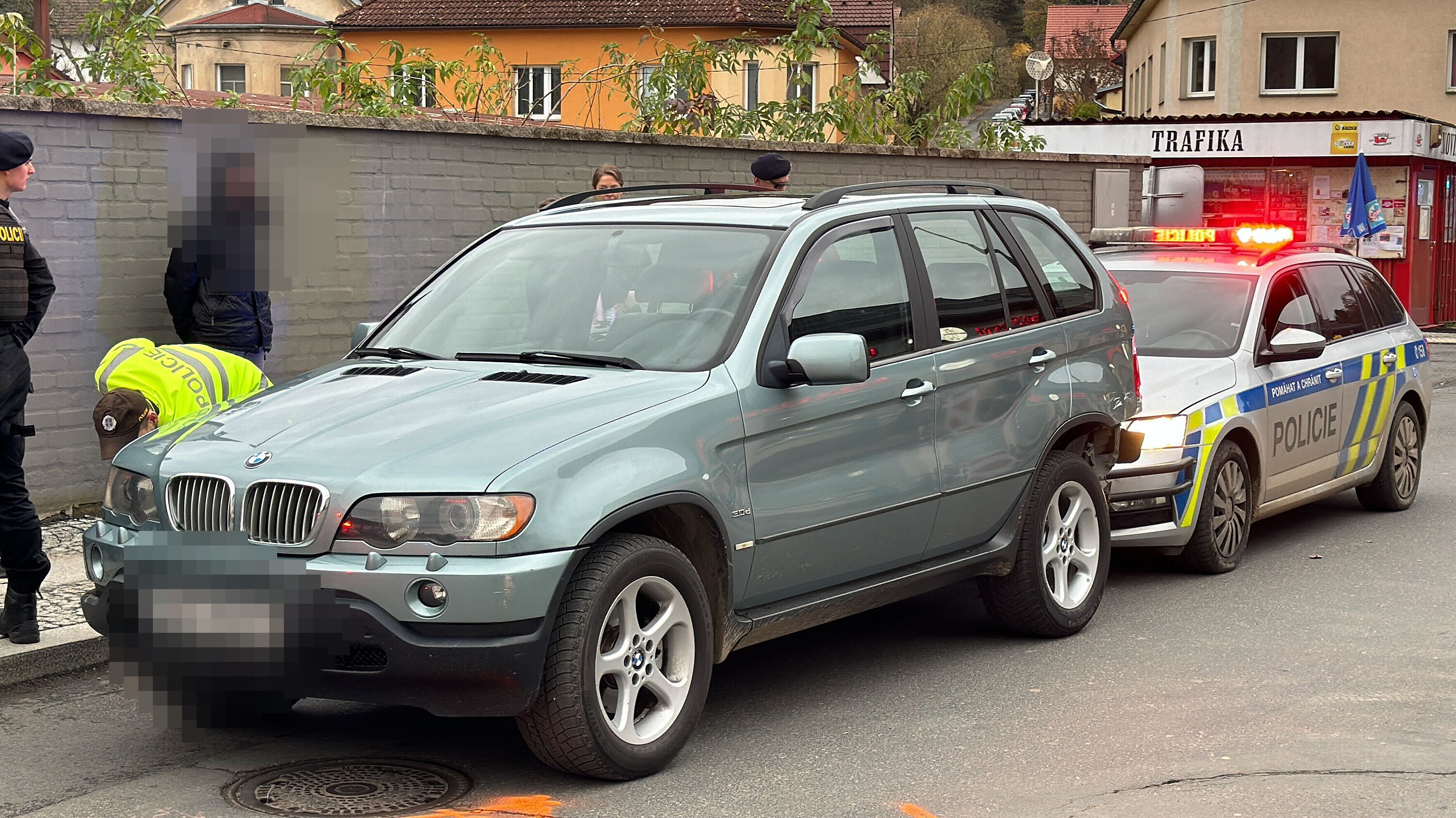 Řidiče totiž zastavil hustý provoz v Mnichovicích, kde se zrovna začaly tvořit kolony. Policie využila situace a dvěma služebními vozy pronásledované auto zablokovala. Při tomto manévru došlo k menším poškozením zúčastněných vozidel.
