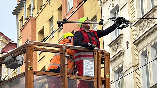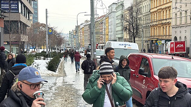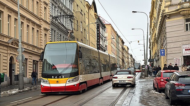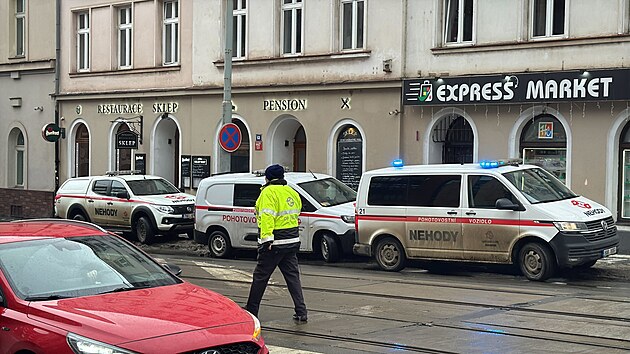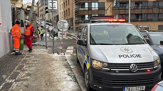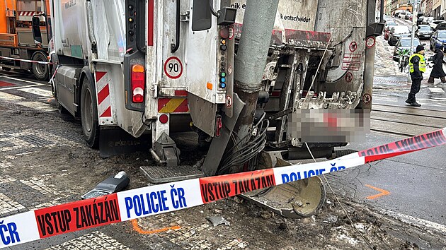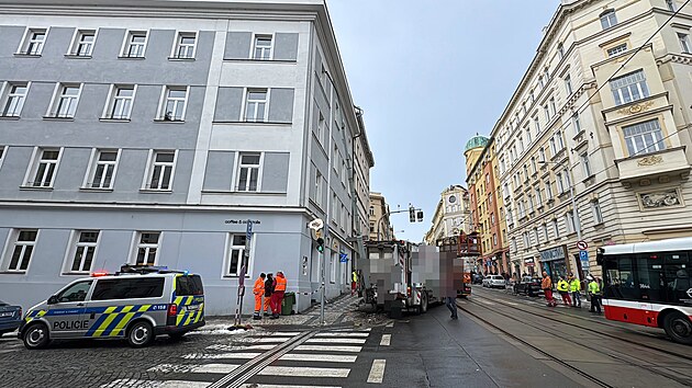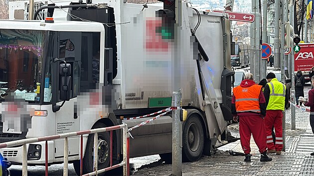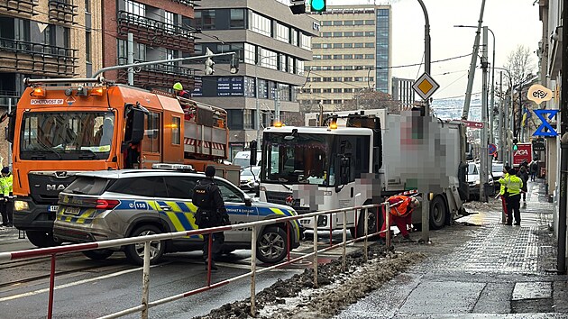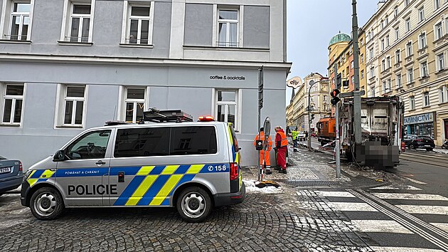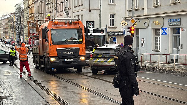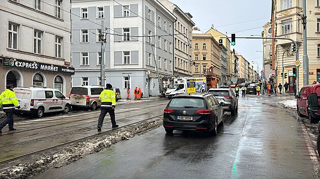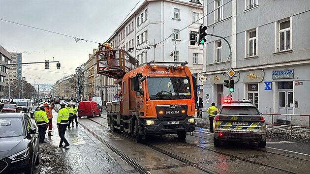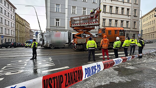 Nákladní vozidlo strhlo v Seifertově ulici v Praze tramvajovou trolej. (14. ledna 2026)