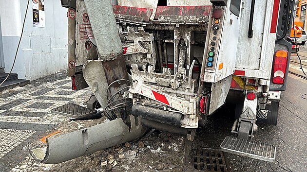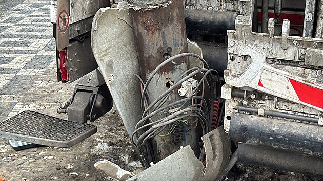 Nákladní vůz strhl v Seifertově ulici v Praze tramvajovou trolej. (14. ledna 2026)