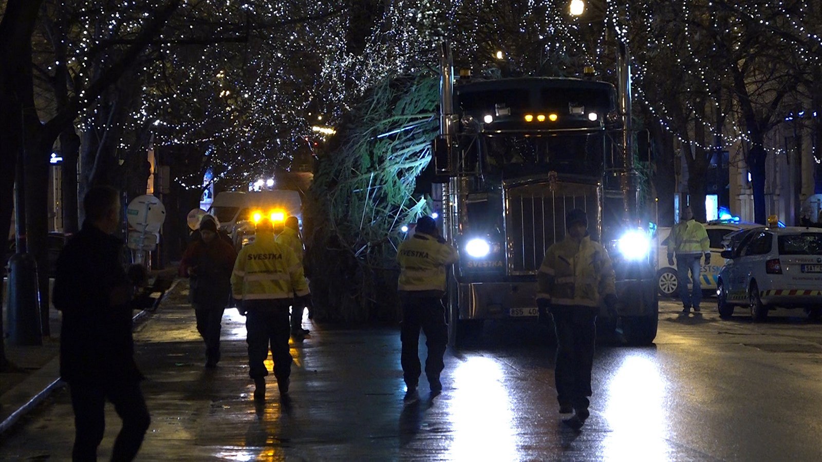 Cesta proběhla bez problému. Až v Pařížské ulici museli asistenti zvednout vánoční výzdobu na okolních stromech, aby se šestašedesátiletý smrk ztepilý z Křivoklátska předčasně neozdobil a nestrhl ji.