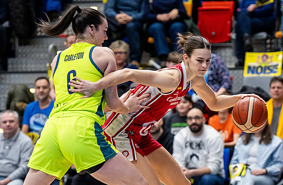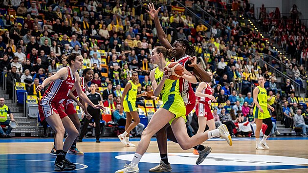 Začátek utkání českým šampionkám vůbec nevyšel a prohrávaly 2:9. První čtvrtinu vyhrál španělský celek 24:17 a na začátku druhé části náskok dál zvyšoval. Od trojky Bridget Carletonové, která zkorigovala na 22:28, ovládl další pasáž 11:4 a byl z toho do té doby nejvyšší náskok v utkání o 13 bodů. Závěr prvního poločasu patřil domácím hráčkám, které snížily na 32:41.
