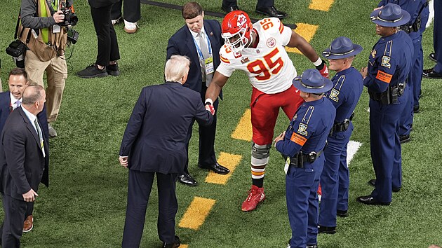 Prezident si na trávníku podal ruku mimo jiné s hvězdou obhájců z Kansas City Chrisem Jonesem. Urostlý obranář se k němu vydal chvíli poté, co s ochrankou dorazil na hřiště. Trump nejprve přibližujícího se dvoumetrového fotbalistu přehlédl, následně se k němu ale otočil a podal mu ruku.