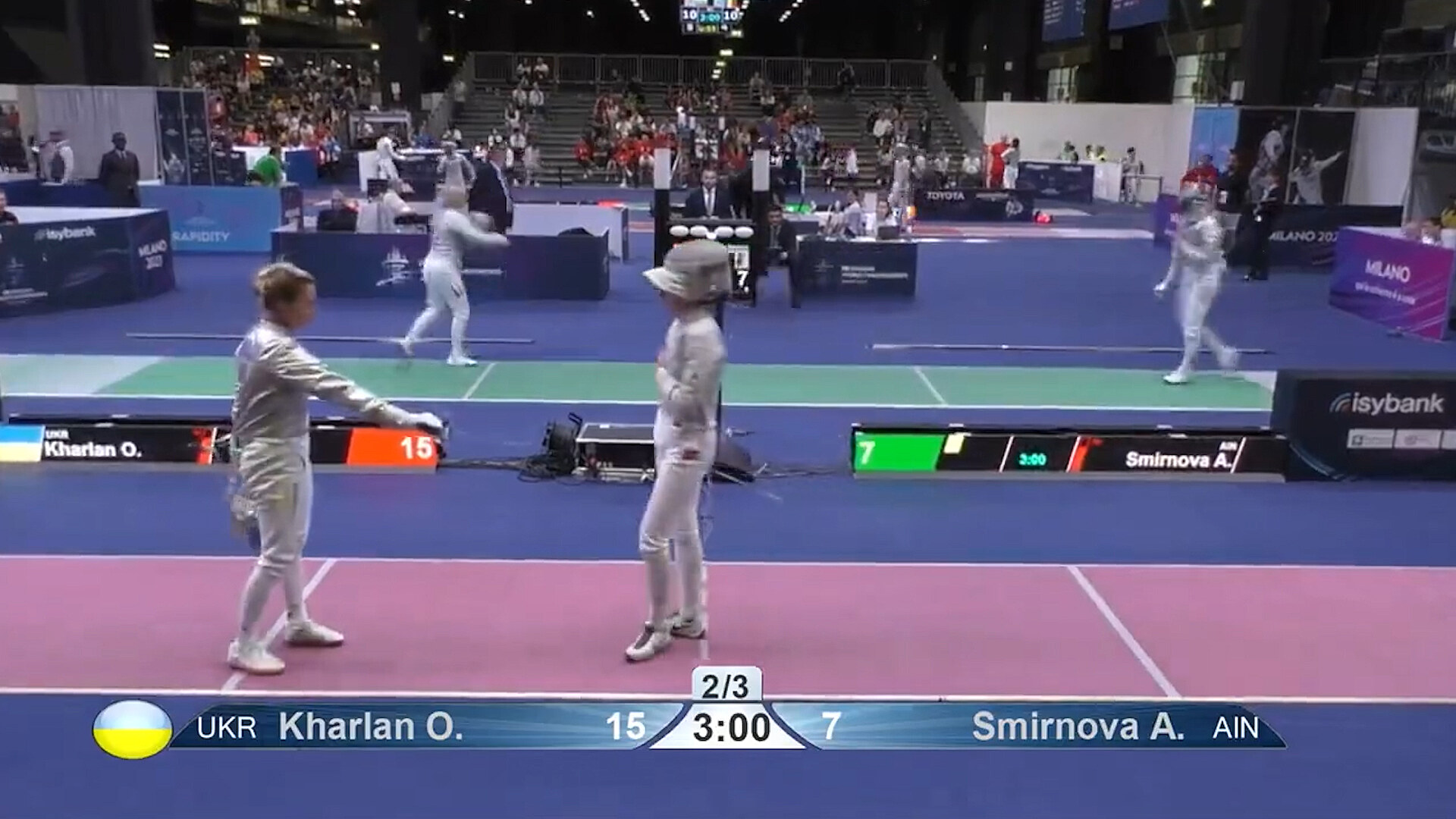 Čtyřnásobná mistryně světa mezi jednotlivkyněmi Charlanová se po tenistech a tenistkách stala další ukrajinskou sportovkyní, která se od začátku ruské invaze utkala v přímém souboji se soupeřkou z okupující země. Smirnovovou porazila 15:7.