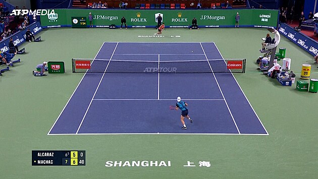 Španěl se ale z nepříznivého stavu dostal a srovnal na 3:3. Poté si oba hráči relativně bez problémů hlídali své servisy, až se Macháčovi v defenzivě podařilo bekhendem prohodit Alcaraze u sítě a dostal se do vedení 6:5. První mečbol v následujícím gamu proměnil forhendovým volejem.