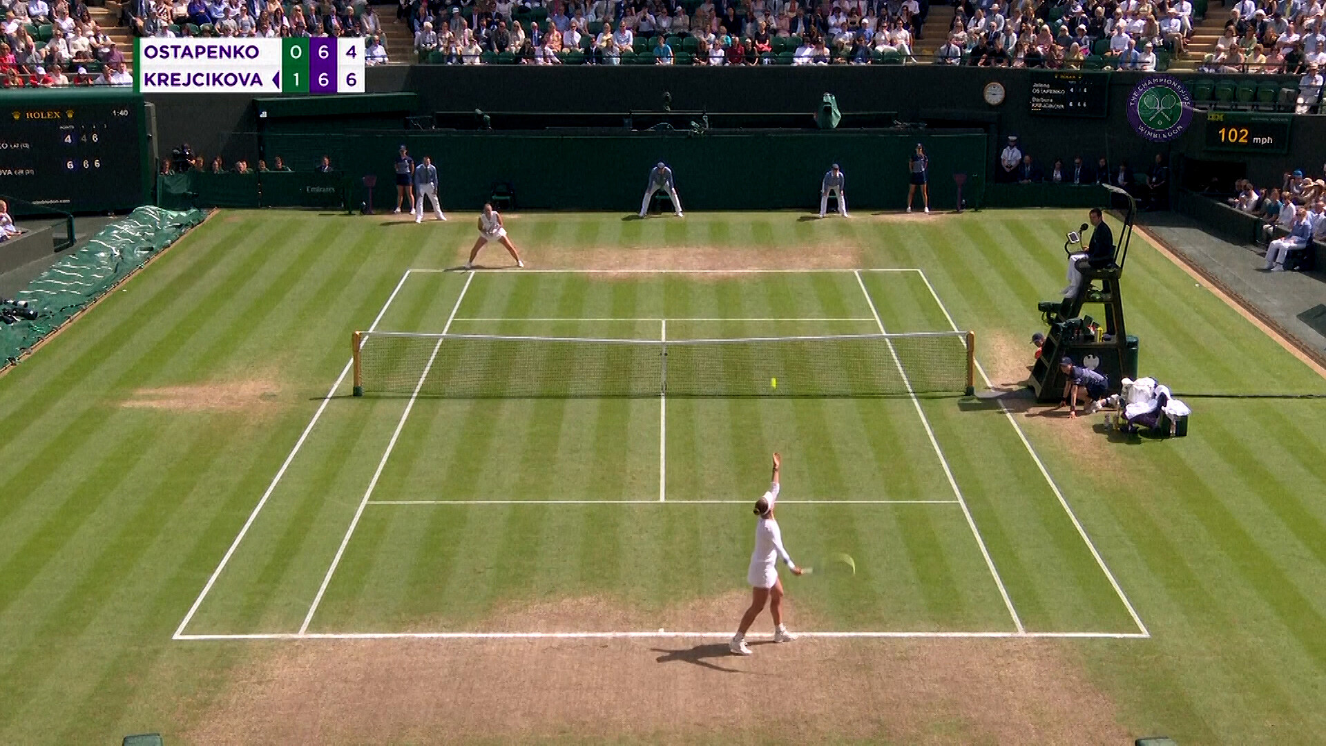Výhodu ovšem nedotáhla a druhou sadu tak rozhodoval tiebreak. V něm Krejčíková potvrdila, že jí letos koncovky ve Wimbledonu sedí. V All England Clubu ovládla už předtím tři ze čtyř zkrácených her, proti Ostapenkové zapsala další úspěšnou.
