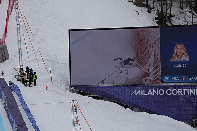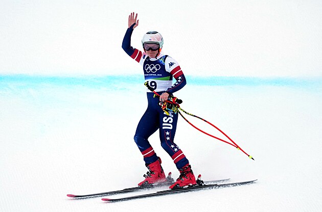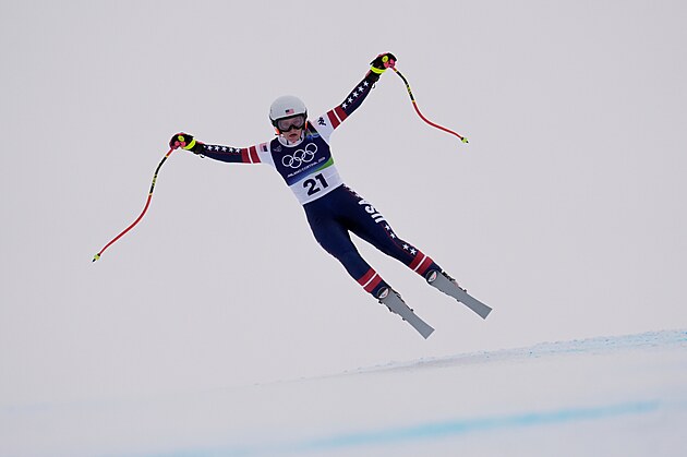 Vítězka sjezdu Breezy Johnsonová na trati olympijského super-G upadla a zastavila se až v ochranné síti.