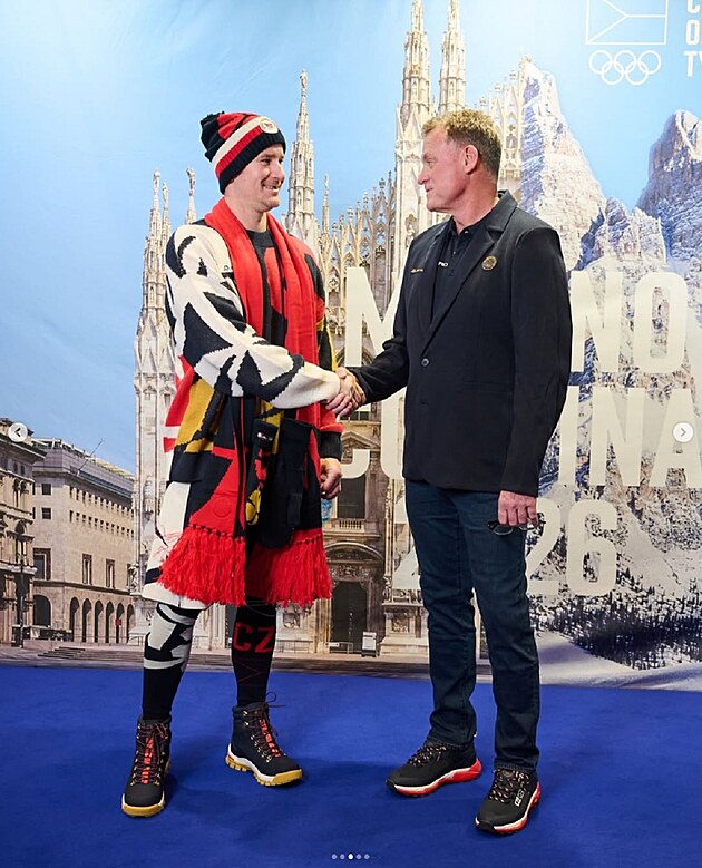 Trenér české hokejové reprezentace Radim Rulík, jeho asistent Tomáš Plekanec, generální manažer Jiří Šlégr a kapitán Roman Červenka si v pondělí převzali a vyzkoušeli olympijskou kolekci určenou pro zimní olympijské hry v Miláně a Cortině.