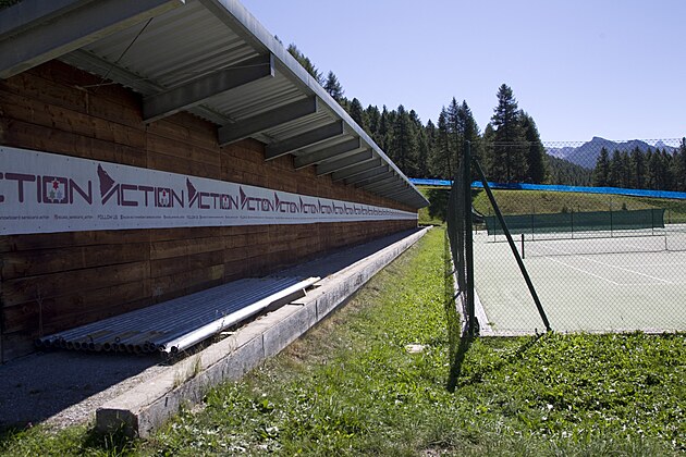 Biatlonová střelnice už původnímu využití neslouží, dnes před ní stojí víceúčelové hřiště.