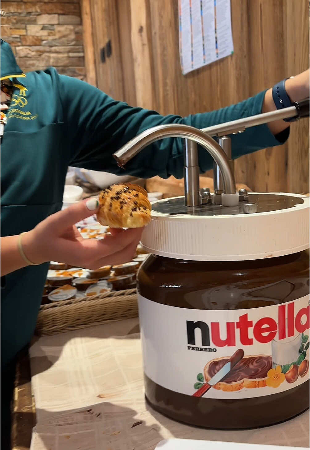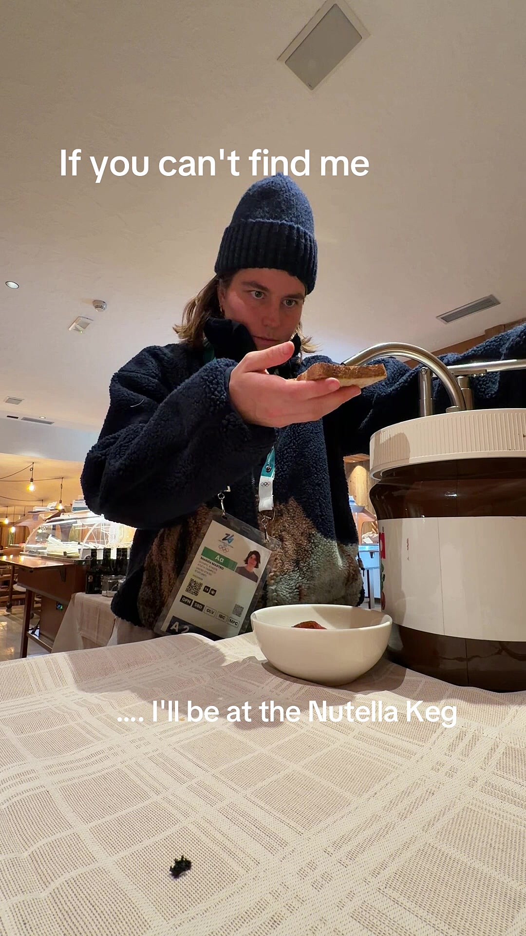 Freestyle lyžařky Daisy Thomasová a Naomi Urnessová si například Nutellou vylepšily croissanty. V první části reelu Australanka Thomasová láká kanadskou kolegyni, ať dorazí do Itálie, protože tam mají něco speciálního. Kanaďanka se ptá co. Pak následuje střih do jídelny a záběr na obří sklenici Nutelly.