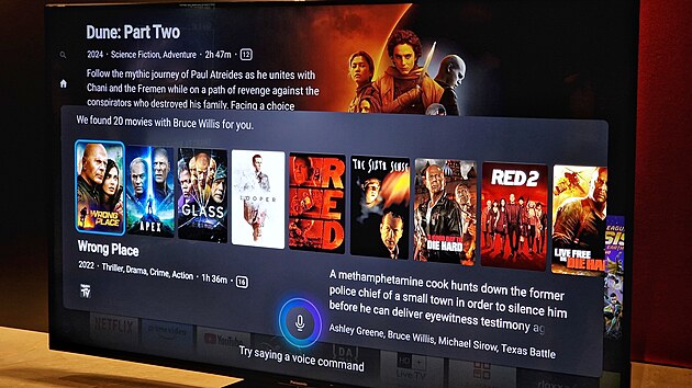 Skvěle totiž funguje vyhledávání. Tituly můžete hledat nejen podle názvu titulu, jmen herců a režisérů, ale třeba i ikonických hlášek – například na „life is like box of chocolate“ systém obratem vyhledá Foresta Gumpa. Záměrně jsme uvedli anglické zadání, protože systém sice bude umět česky (samozřejmě ale nevíme, jak dobře), ale na prezentaci byl přepnutý do angličtiny. Ve vyhledávání lze využít i doplňujících otázek, takže pokud si třeba vyhledáte komedie s Jimem Carreym, můžete výsledek v druhém kroku omezit jen na tituly natočené před rokem 2000. Vyhledávání jsme zkoušeli pomocí hlasového zadávání, nikoli tedy ťukáním na virtuální klávesnici.