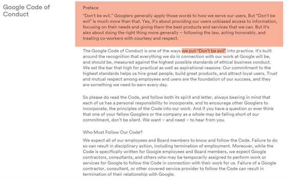 Nový kodex totiž zcela vynechal úvod, který v původním kodexu (archiv z 21. dubna 2018) zněl následovně: „Nepáchejte zlo. Zaměstnanci Google se řídí těmito slovy při své práci pro naše uživatele. Ale ‚Nepáchejte zlo‘ je mnohem více. Ano, zahrnuje to poskytování nezkresleného přístupu k informacím, důraz na potřeby uživatelů a vývoj nejlepších služeb. Ale znamená to i něco více: dělat vždy tu správnou věc, dodržovat zákon, chovat se čestně a chovat se mezi kolegy k sobě navzájem se slušností a úctou.“
