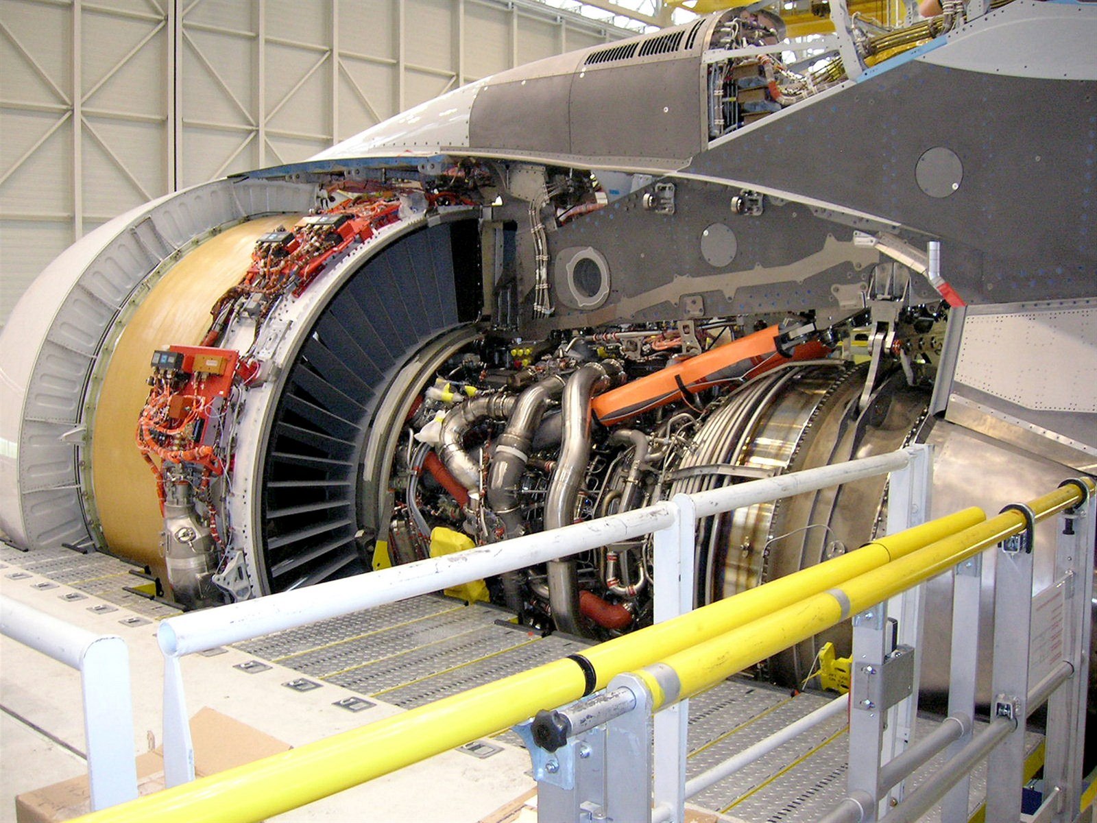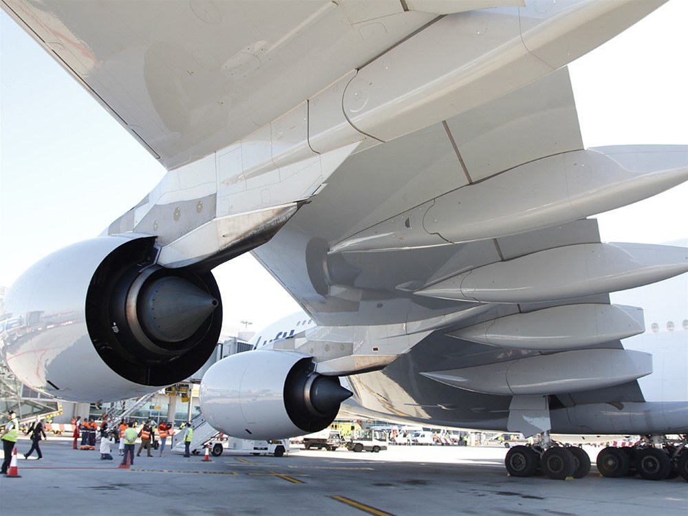 Pohled pod křídlo A380. Letadlo pohání čtveřice motorů. Aerolinky si mohly vybrat ze dvou typů: Rolls-Royce Trent 900 nebo Engine Alliance GP7000. Lufthansa na svých strojích používá první z nich. Každý motor má tah 310 kN.