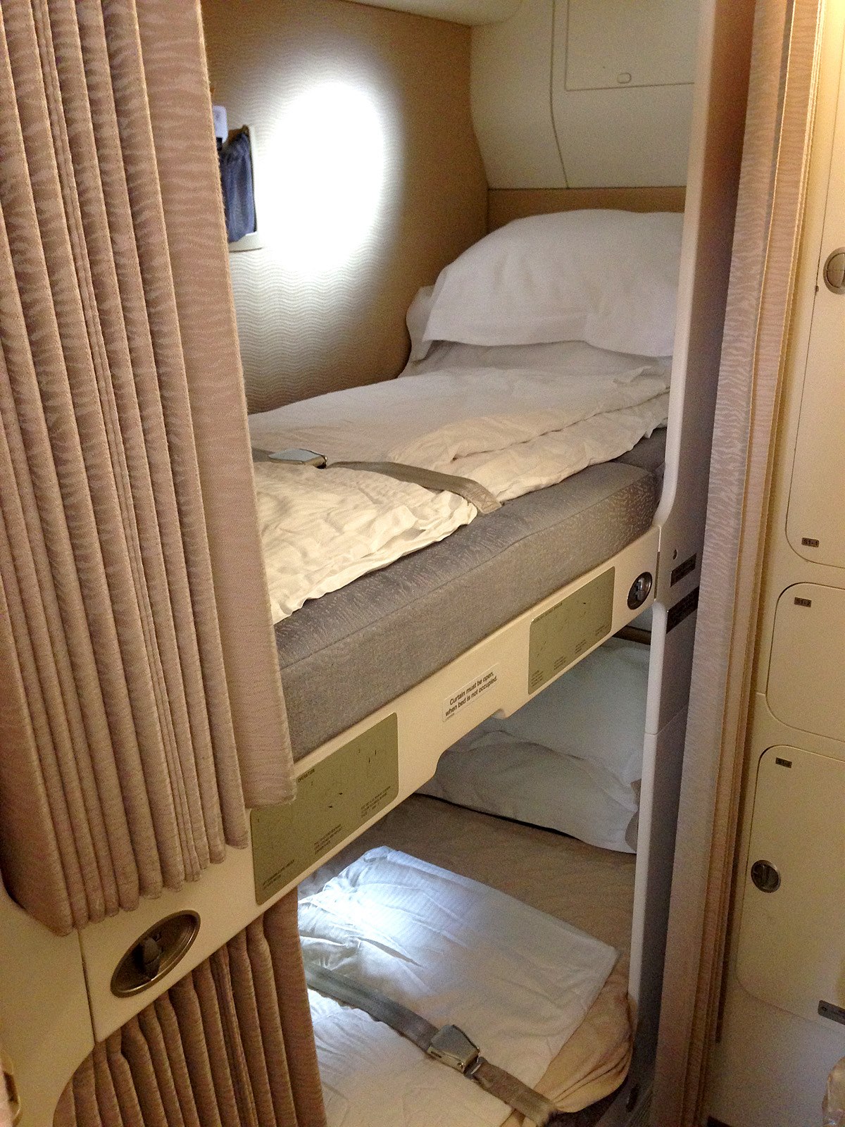 Takto vypadá ložnice pro posádku. V zadní části letadla jsou dvě lůžka pro piloty a v odděleném prostoru dalších devět pro stevardy.