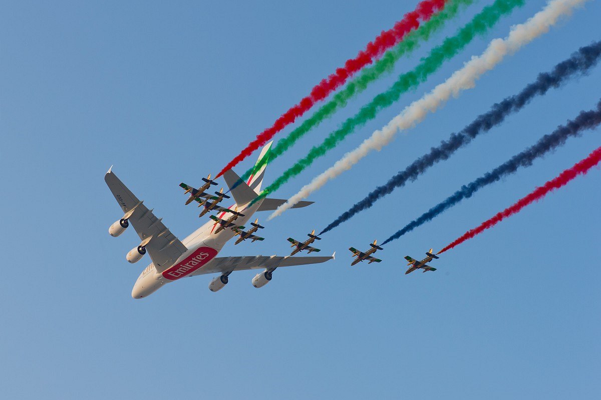 Airbus A380 společnosti Emirates v doprovodu akrobatické skupiny Al Fursan na strojích Aermacchi MB-339NAT