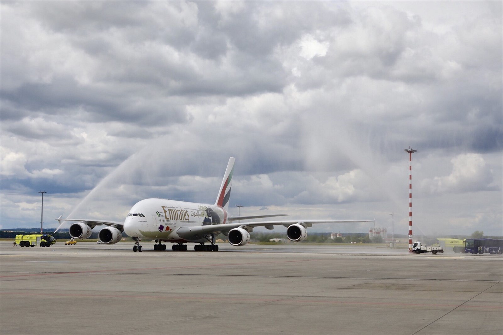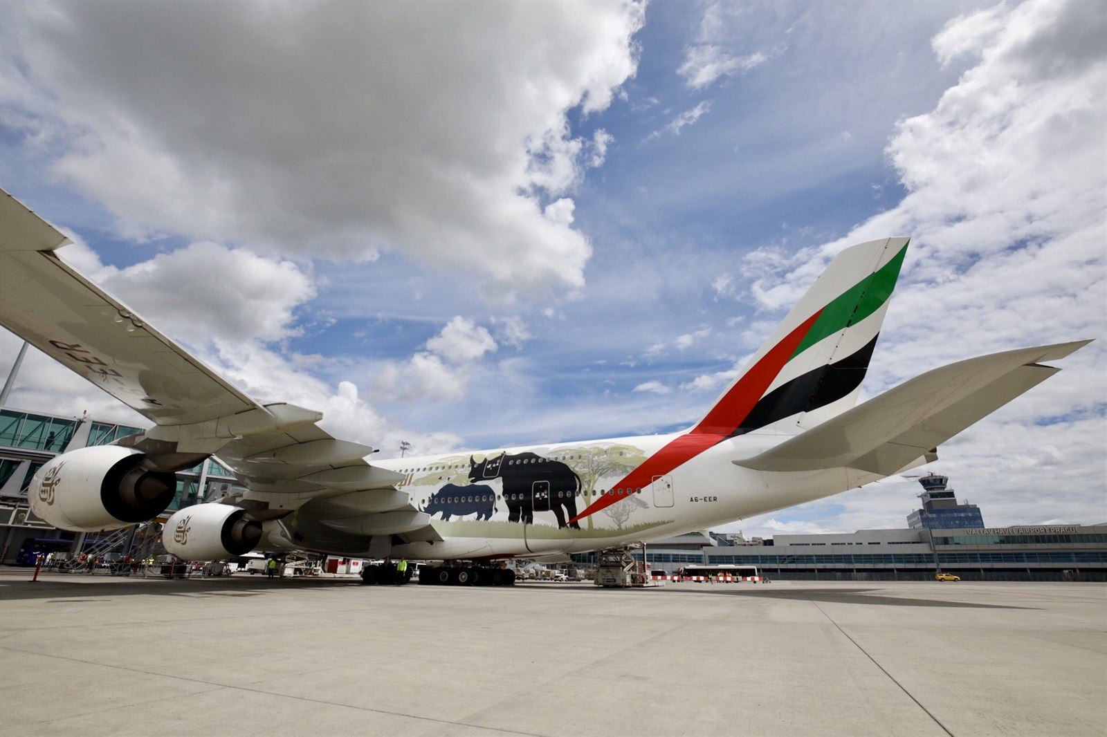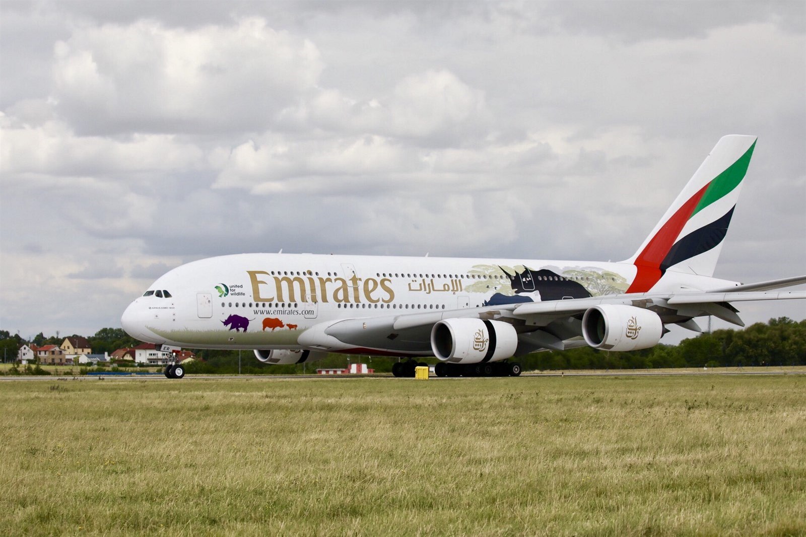 Airbus A380 ve speciálním zbarvení United for Wildlife, který přistál v Praze 1. července 2017.