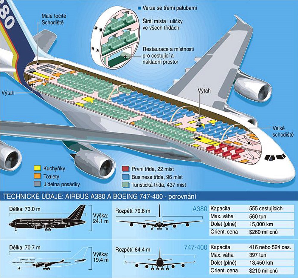 A380 má různé konfigrace. Verze A380-800 pojme v plně ekonomické až 853 cestujících, resp. 400 v luxusní variantě. Specifikace A380 vs. Boeing 747-400 zvané Jumbo možné porovnat na obrázku.