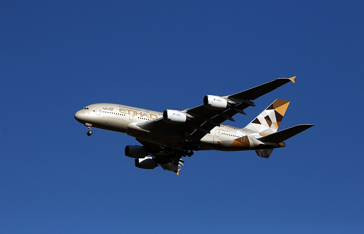 Letadlo Airbus A380-861 společnosti Etihad Airways přistává na letišti Heathrow. (28. ledna 2016)