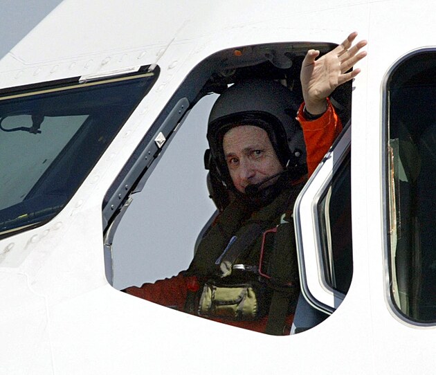 Kapitán Claude Lelaie mává z kokpitu největšího dopravního letounu světa Airbus A380 po prvním testovacím letu 27. dubna 2005 na letišti v Toulouse