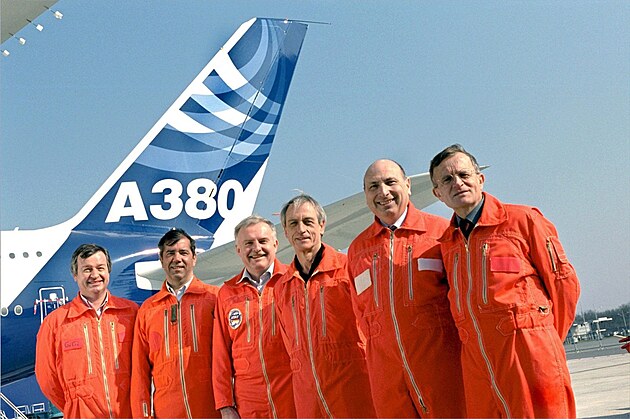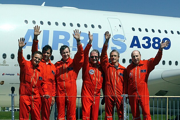 Posádka největšího dopravního letadla světa Airbus A380, které 27. dubna v Toulouse ve Francii podnikla první zkušební let. Jsou v ni (zleva) Gerard Desbois, Rafael Alonso, Manfred Birnfeld, Jackie Joye, Claude Lelaie a Jacques Rosay.