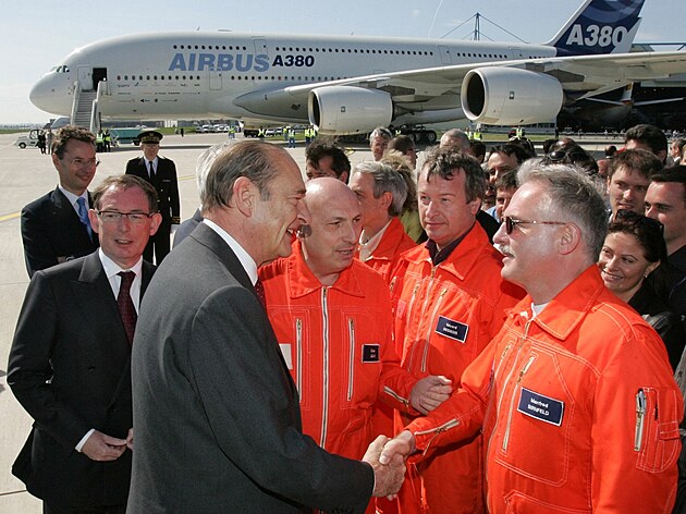 Francouzský prezident Jacques Chirac gratuluje posádce prvního letu Airbusu A380.