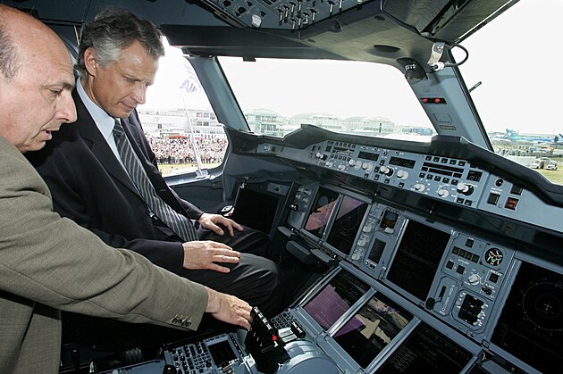 Francouzský premiér Dominique de Villepin sedí na místě kapitána A380 a hlavní testovací pilot Claude Lelaie mu popisuje avioniku. Paris Air Show 18. června 2005