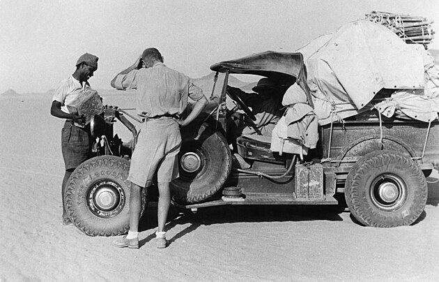 Historický snímek z druhé Almásyho expedice v roce 1933 do oblasti plošiny Gilf Kebír na jihozápadní egyptské hranici. Účastnili se hrabě Lázslo Almásy, britský podplukovník RAF Hubert Penderel a maďarský geolog a geograf dr. Kadar. Fotografoval Hans G. Casparius. | foto: CTK / ullstein bild / Hans G. Casparius