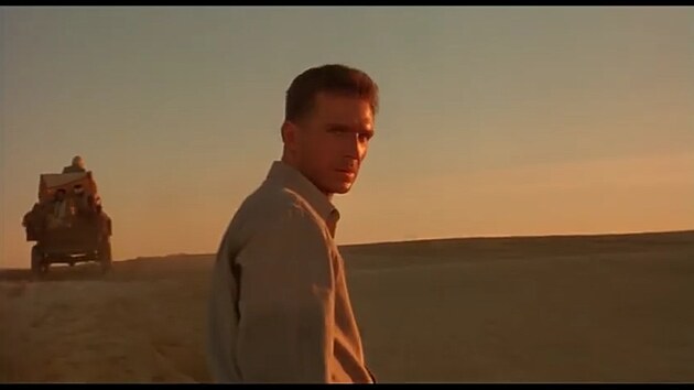Devíti Oskary oceněný filmový snímek vcelku logicky zjednodušuje strukturu knihy a akcentuje příběh pacienta, maďarského hraběte Almásyho. Jde o spalující milostný příběh mezi svérázným dobrodruhem a vdanou ženou Katharine Cliftonovou. Tu do skupinky pouštních samorostů přivede její manžel Geoffrey Clifton, letec, fotograf a ve skutečnosti zpravodajec, jenž má za úkol letecké mapování oblasti (a snad i ohlídání podivné národnostní směsice v expedici). Nás samozřejmě okamžitě praští do očí, že ve filmu létá v americkém letounu Boeing Stearman (kniha se drží Gipsy Motha).