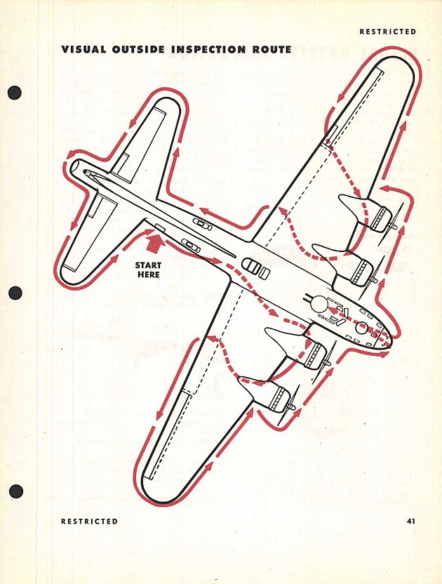 - Před startováním je potřeba ujistit se, že jsou kola zajištěna špalky. Následuje vizuální kontrola letadla