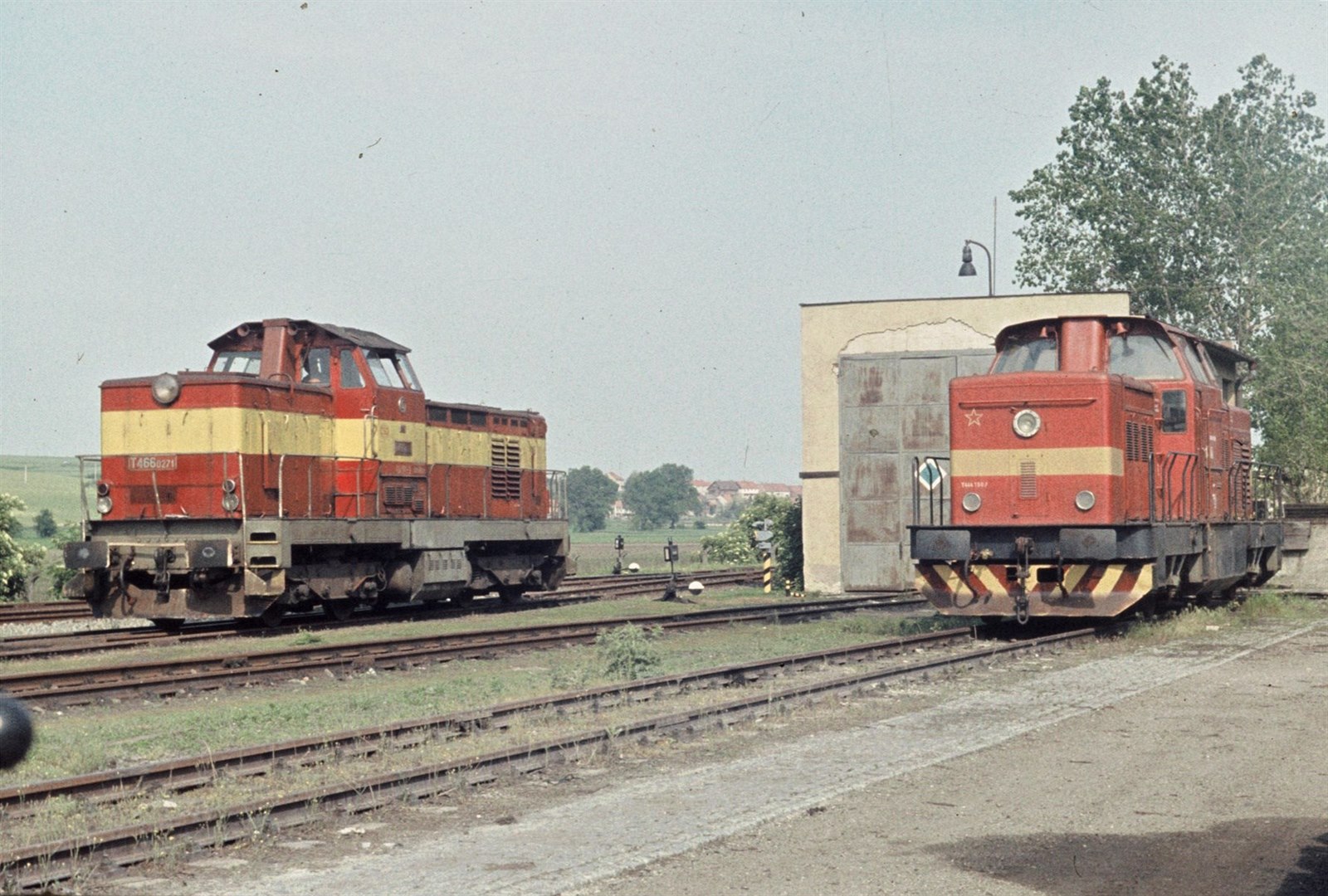 Dvojice zdánlivě podobných lokomotiv, vlevo lokomotiva řady T466.0 zvaná Pilštyk a vpravo starší lokomotiva řady T444.1 zvaná Karkulka. Také Karkulka se vyráběla v Martině, ale měla hydrodynamický přenos výkonu a konvenčnější spalovací motor značky ČKD.