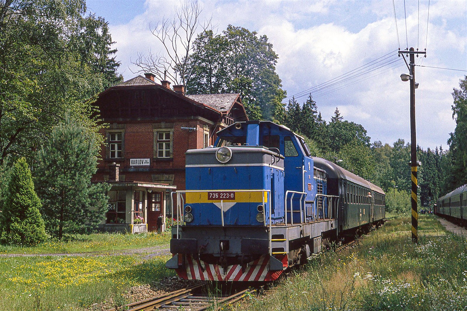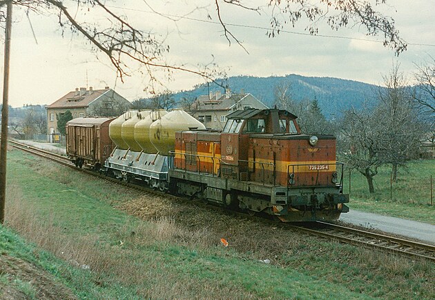 Lokomotiva řady T466.0 (původní Kryšpínovo značení), respektive 735 (nové značení platné od 1. ledna 1988), dostala přezdívku Pilštyk podle instalovaného dieselového motoru značky Pielstick francouzské konstrukce a u nás v licenci vyráběného. Někde lokomotivě říkali Fujara, což zase byla narážka na zvuk z výfuku při rozjezdu. (foto: Lokomotiva řady 735 v Hradčanech na cestě z Čebína do Tišnova, začátek 90. let 20. století)