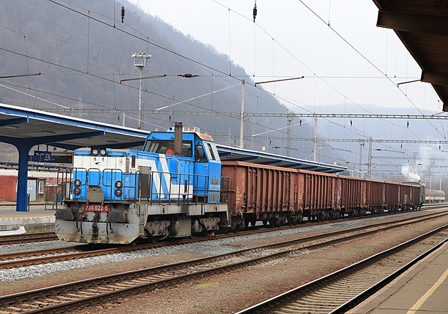 Lokomotiva řady T466.0 táhne vagony s lignitem (druh hnědého uhlí) na vlečce mezi Ústředním zásobníkem Šardice a železniční stanicí Dubňany.