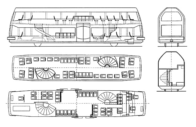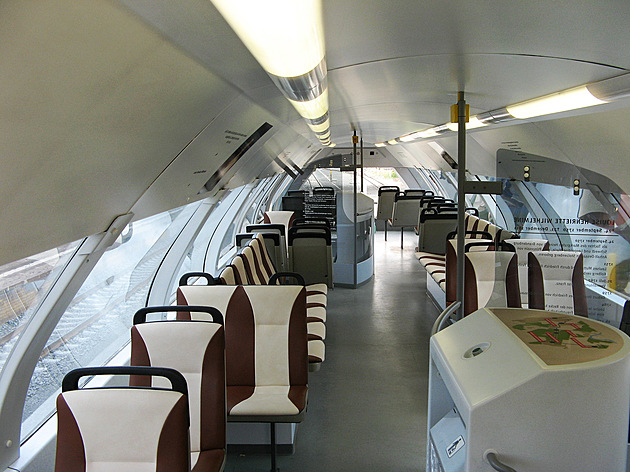 A zde jsme v patře vozu. Celková přepravní kapacita se uvádí 78 sedících a 32 stojících cestujících. Pro výrobu se plánovala i menší variabilita dle konkrétní objednávky, kdy mohl být redukován počet sedadel na úkor zvýšení počtu míst k stání a naopak.