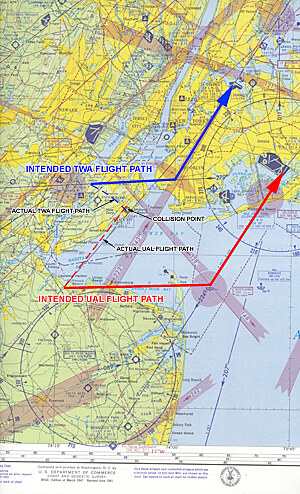 Problémy nastaly, až když se oba letouny více přiblížily k New Yorku. Navigování obou strojů si newyorští dispečeři, jež je měli bezpečně dovést k ranveji, převzali pár minut před půl jedenáctou dopoledne. Piloti staršího stroje TWA dostali postupně několik pokynů ke změně kurzu a nakonec i povolení ke klesání do výšky patnácti set metrů.