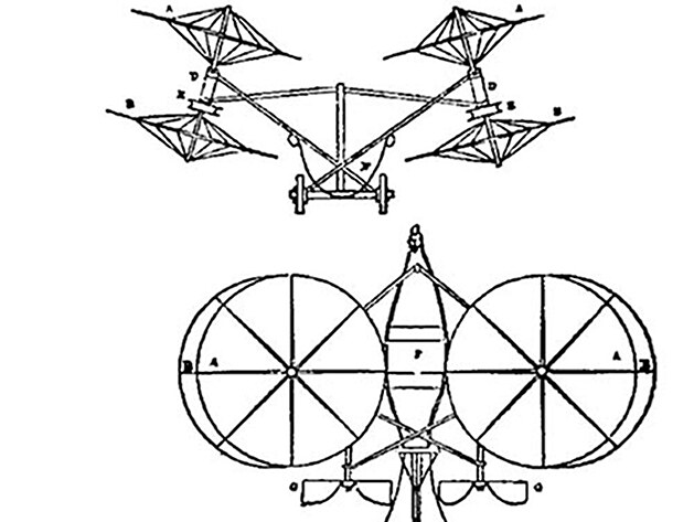 Pro nás je důležitý jeho náčrt z roku 1843, zobrazující „aerial carriage“, což byl létající aparát s předpokládaným kolmým vzletem a přistáním. Vznik tahu měly zajišťovat dvě koaxiální dvojice rotorů umístěné vedle sebe. Se svými ideami předběhl dobu o několik desetiletí. Dokonce ještě dlouho potom, co existovaly motory s vnitřním spalováním, nebyl jejich měrný výkon tak velký, aby zvedly nějaký stroj spolehlivě kolmo vzhůru. Druhým zásadním problémem byly otázky stability a řiditelnosti takového stroje.