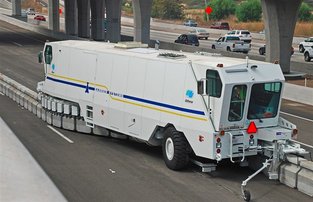 Speciální "dodávka" zvaná Zipper umí překládat betonové mantinely rychlostí 13 km/h a upravit tak počet jízdních pruhů za plného provozu.