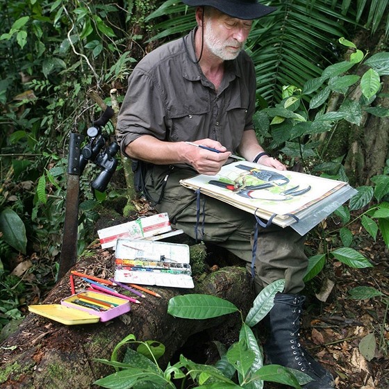 Moje vzory mají spíš historickou podobu. Jsou to John James Audubon, John Gould a taky Edward Lear. Ten dramatik, který byl také naprosto skvělý ilustrátor, což se málo ví. To byli lidi, kteří položili základy moderní vědecké ilustrace a například zásadní Audubonovo dílo Birds of America se dnes prodává za miliony dolarů. Byl to také on, kdo první jezdil do přírody malovat ptáky v realitě, což ve své době bylo naprosté nóvum. Před tím to malíři nedělali, a proto mají jejich ptáci často tak podivné tvary, anebo jim dokonce třeba chybí nohy. Malovali je totiž podle kůží, které dovážely do Evropy lodě z exotických krajů. Mimochodem dneska už to opět skoro nikdo nedělá, protože je to nepohodlné. Myslím, že v Amazonii jsem v současnosti asi jeden z mála.
