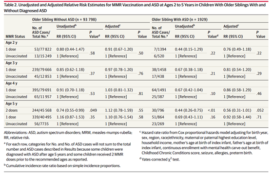 Výsledky potvrdily, že mezi vakcínou MMR a autismem neexistuje statistická souvislost. A to ani u dětí, které mají staršího sourozence s autismem a je u nich tedy statisticky větší nebezpečí. Ať už byly děti očkované nebo ne, rozvinutí symptomů autismu u nich bylo stejně pravděpodobné. Potvrdilo se ovšem, že pokud je starší sourozenec na autistickém spektru, jeho mladší sourozenec má vyšší pravděpodobnost, že se autismus projeví i u něj (6,9 %, oproti běžným 0,9 %).