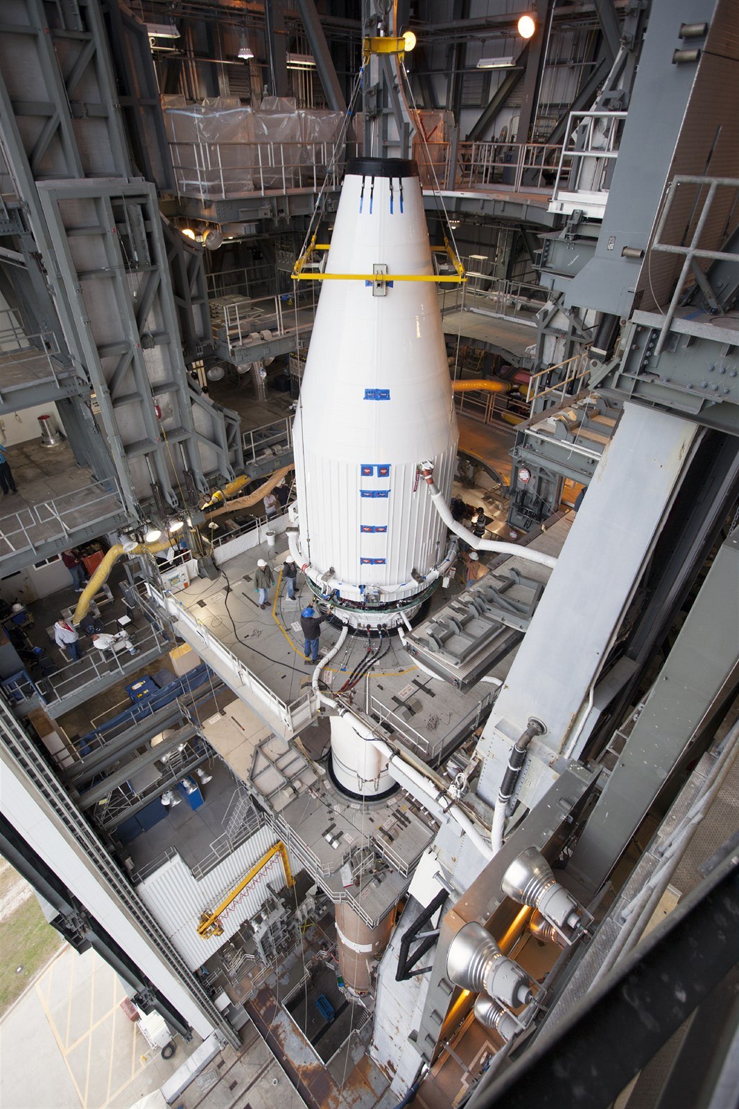 Nyní se již druhý měsíc vědci NASA pokoušejí s družicí spojit poté, co na začátku prosince zjistili z analýzy signálu, že se sonda otáčela neočekávaným způsobem, to by naznačovalo, že se trajektorie oběžné dráhy Mavenu mohla změnit. Na snímku jsou úpravy rakety Atlas V, která se připravuje ke startu k Marsu s družicí Maven.