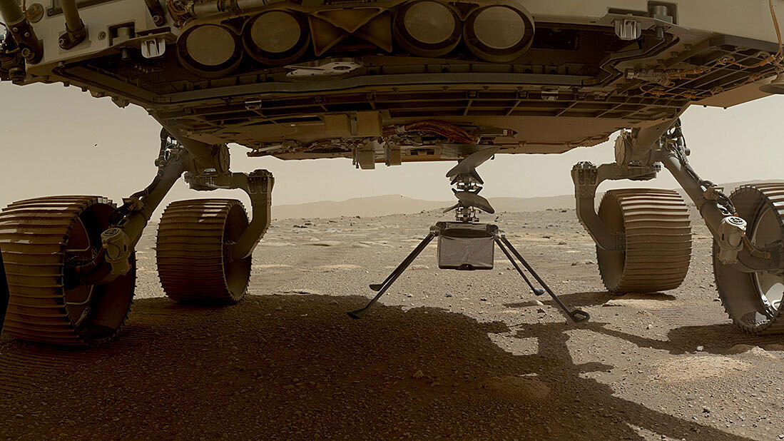 Vozítko Perseverance již dokončilo první jízdy na planetě, které byly naplánovány umělou inteligencí. Demonstrace se konala 8. a 10. prosince, když během testu AI zvládla úkol výběru waypointů pro rover, což je podrobný plánovací proces, který tradičně provádějí lidští operátoři roverů. Snímek ukazuje vysazení vrtulníčku Ingenuity z mobilní laboratoře Perseverance