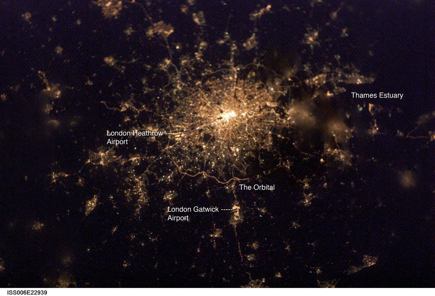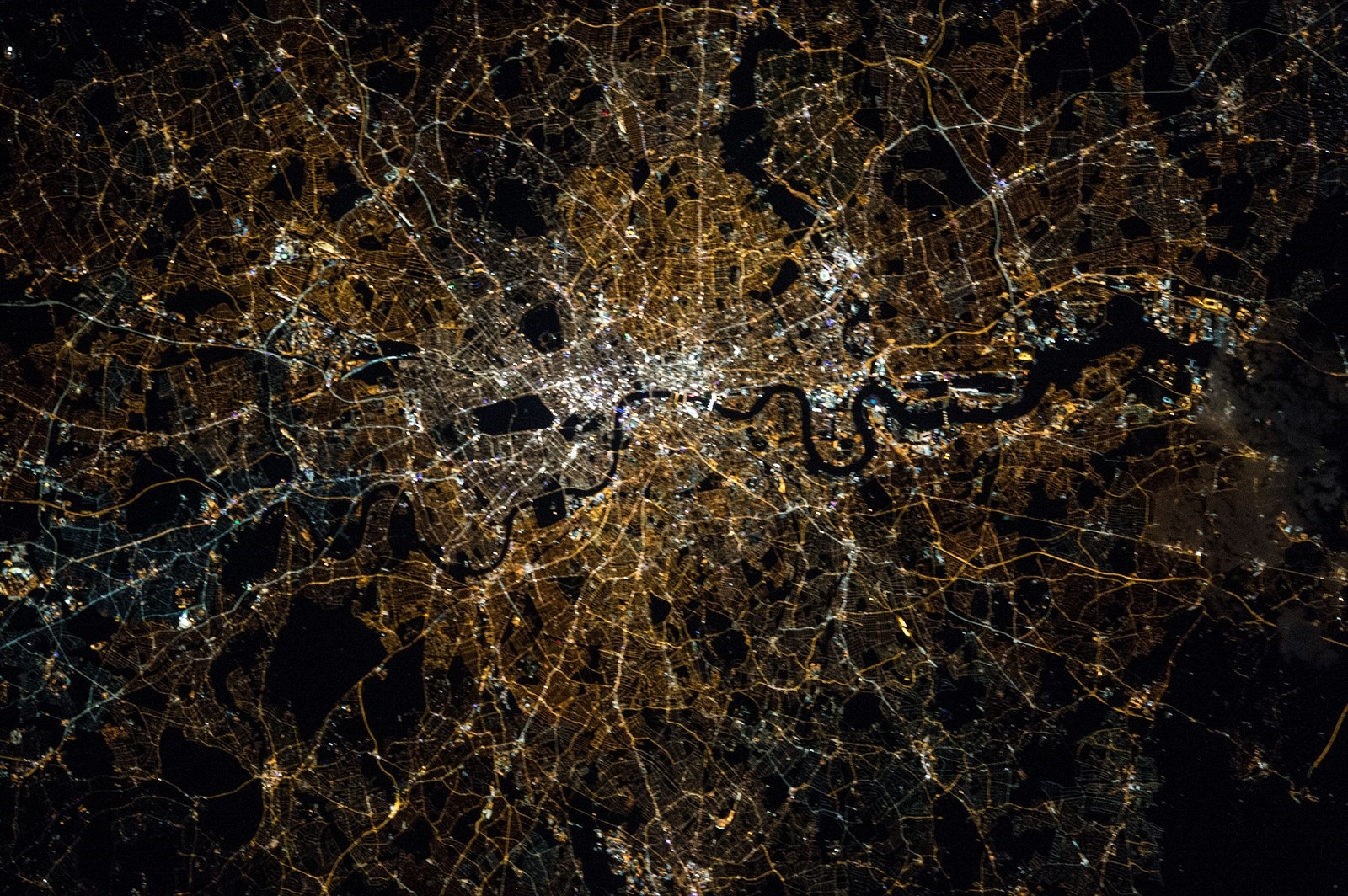 Noční pohled na britskou metropoli Londýn u ústí řeky Temže nabízí zajímavý pohled na rozložení hustoty obydlení města i jeho infrastrukturu.