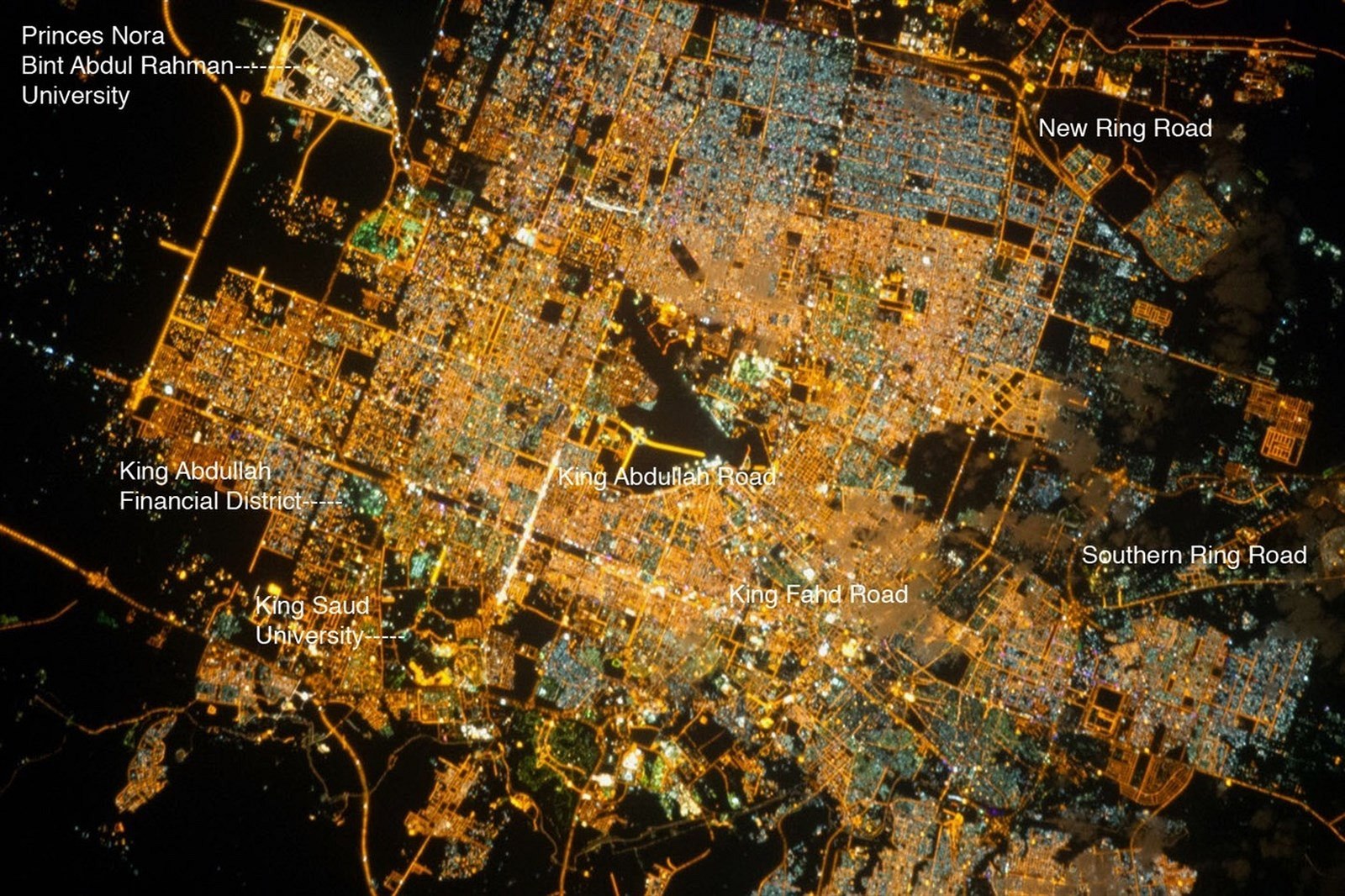 Na záběru Rijádu v Saúdská Arábii nejjasněji svítí obchodní čtvrtě podél promenád King Abdullah Road a King Fahd Road.