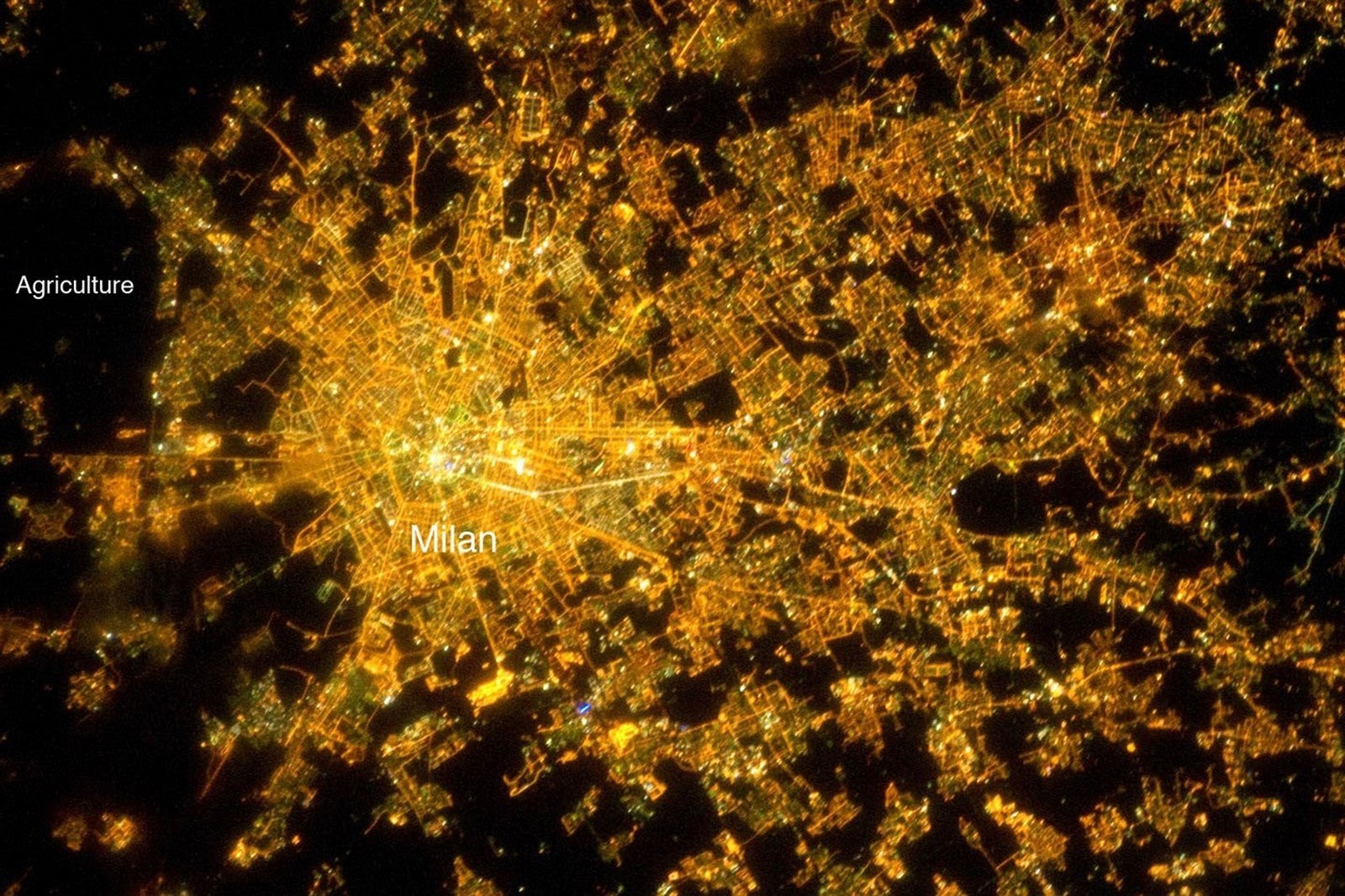 Milán je druhé největší italské město a hlavní město Lombardie vypadá v noci z vesmíru jako prošívaná deka ve stylu patchworku.