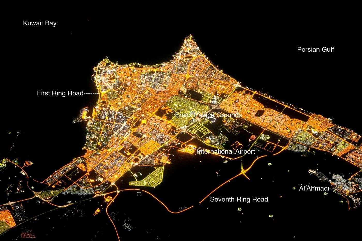 Kuvajt, hlavní město stejnojmenného státu, leží na severozápadním pobřeží Perského zálivu. Ozářené město vyniká zejména v kontrastu s temným Zálivem a řídce osídlenou pouští.
