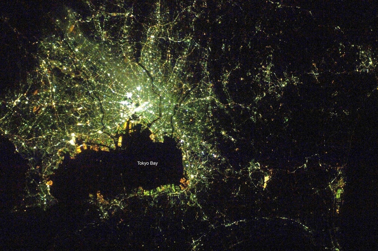 Japonská města září v noci studenějším světlem než jiné světové metropole, jak je vidět na tomto snímku Tokia. Novou výstavbu kolem Tokijského zálivu charakterizuje oranžová barva vysokotlakých sodíkových výbojek, zatímco většina území svítí lehkými zelenými tóny rtuťových výbojek.