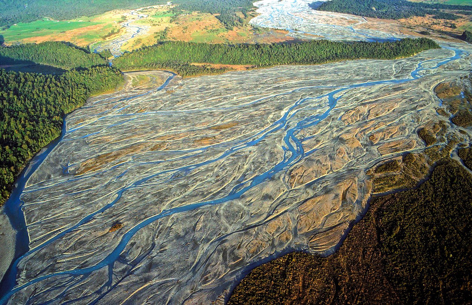 Letecký pohled na říční tok Waiho a 11 tisíc let staré ledovcové morény na západním pobřeží Jižního ostrova na Novém Zélandu