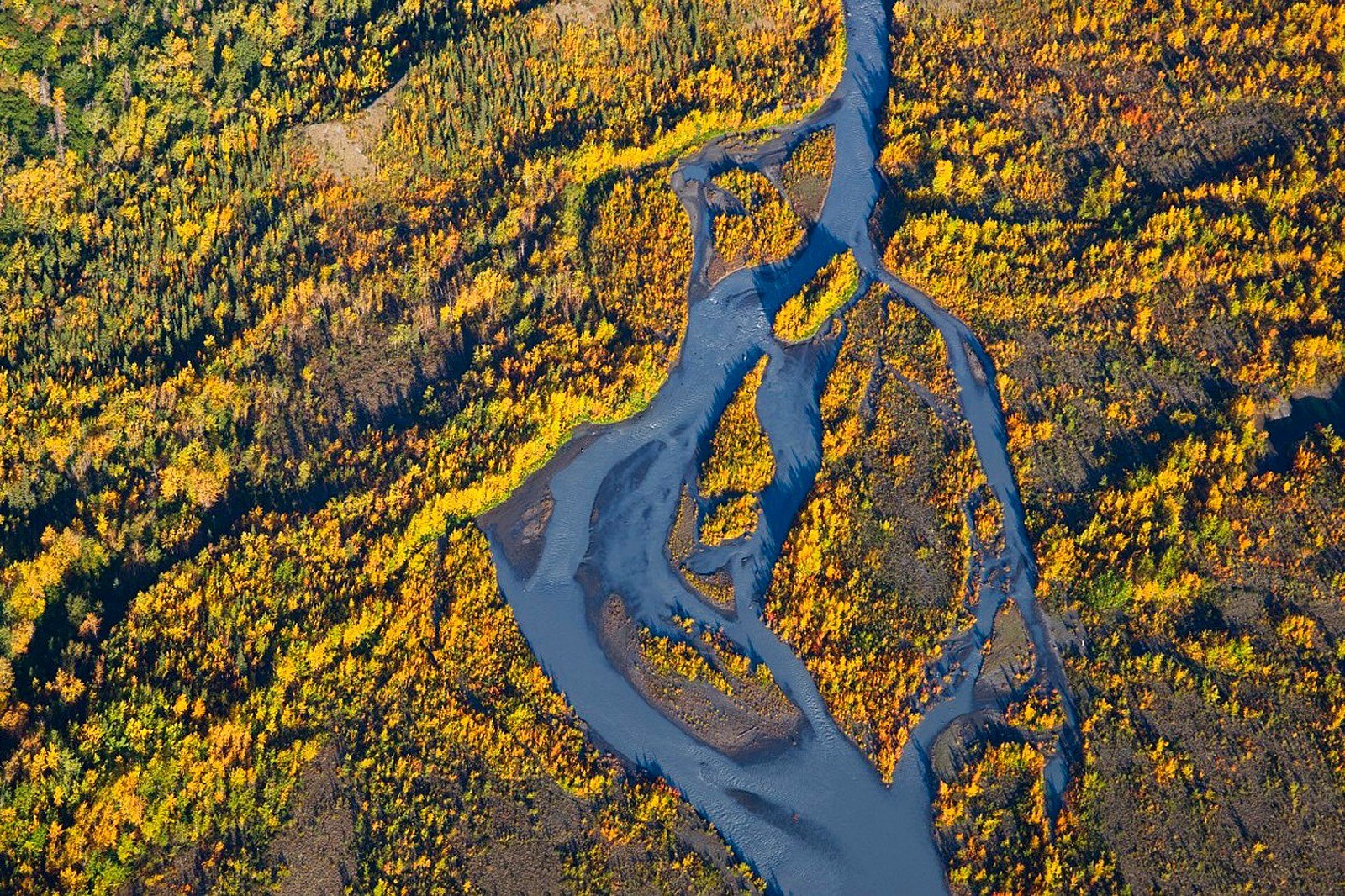 Letecký pohled na rozvětvený tok řeky Eagle v kontrastu s podzimními barvami ve státním parku Chugach v jihocentrální Aljašce