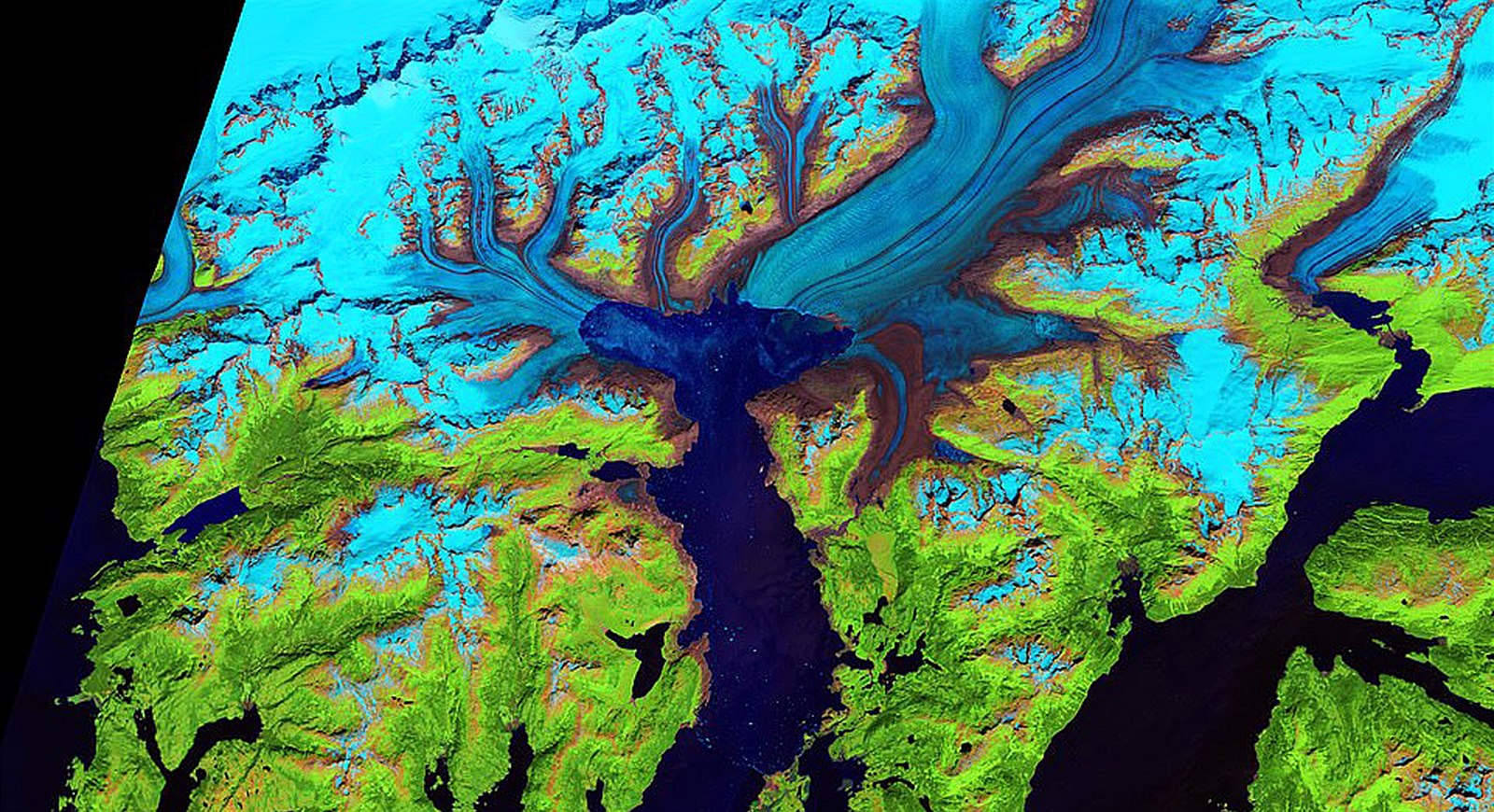 Tento dobarvovaný snímek pořízený v červenci 2014 satelitním přístrojem Operational Land Imager ukazuje ústup ledovce Columbia na Aljašce.