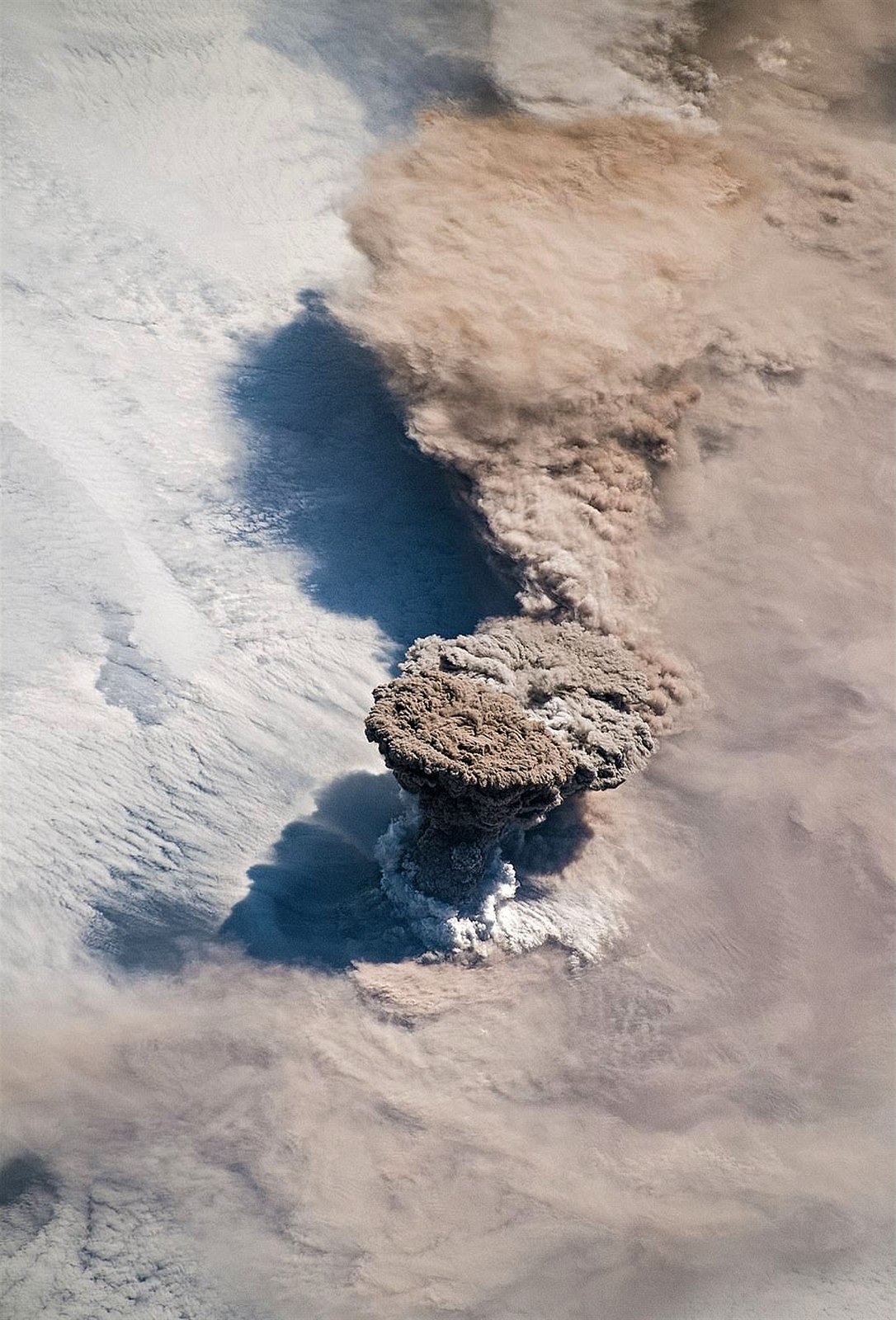 Tento snímek, pořízený ráno 22. června 2019 z ISS, zachycuje vzácnou erupci sopky Raikoke na Kurilských ostrovech v Tichém oceánu.