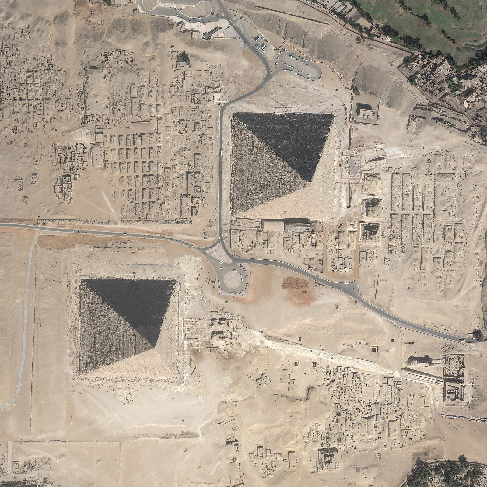 Satelitní snímek zachycuje část pyramidového pole v egyptské Gíze, na němž jsou vidět pyramidy panovníků 4. dynastie Chufua (řecky Cheops) a Rachefa (dole). Oba vládli před 4,5 tisíci let. Na snímku vpravo dole je areál Velké Sfingy.